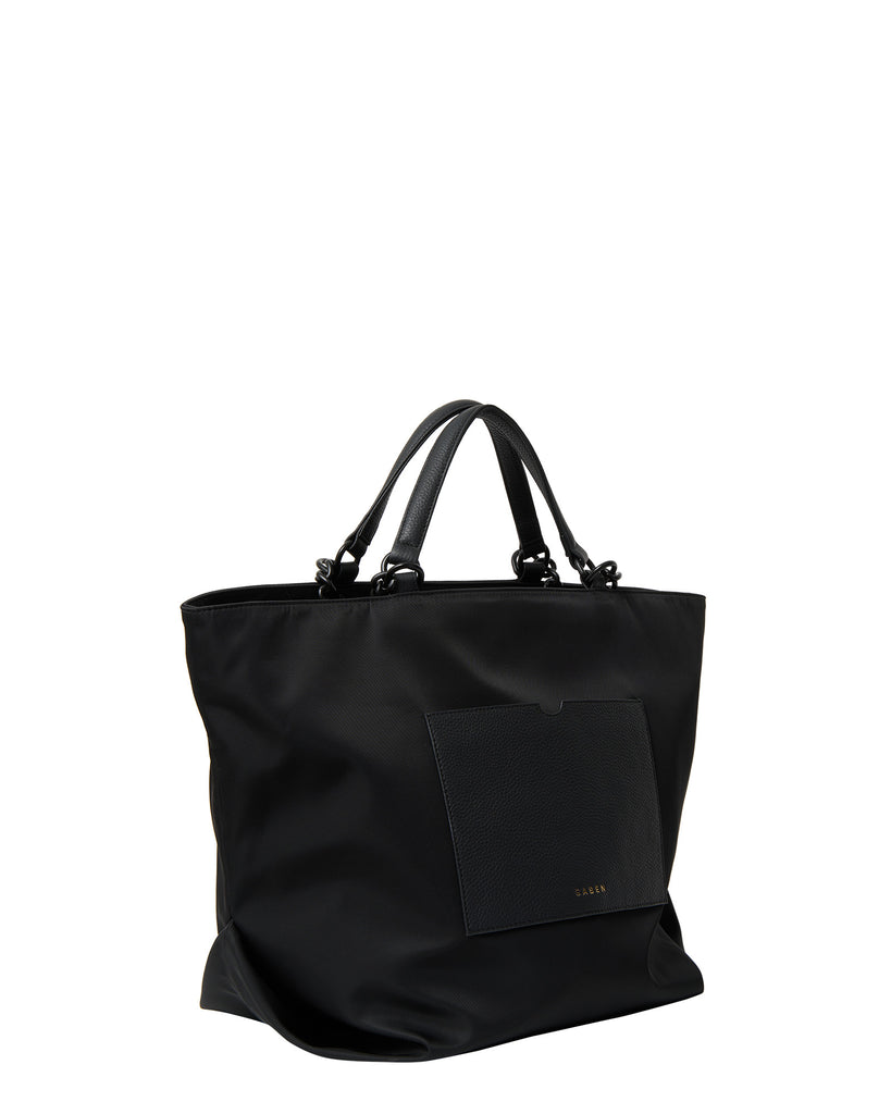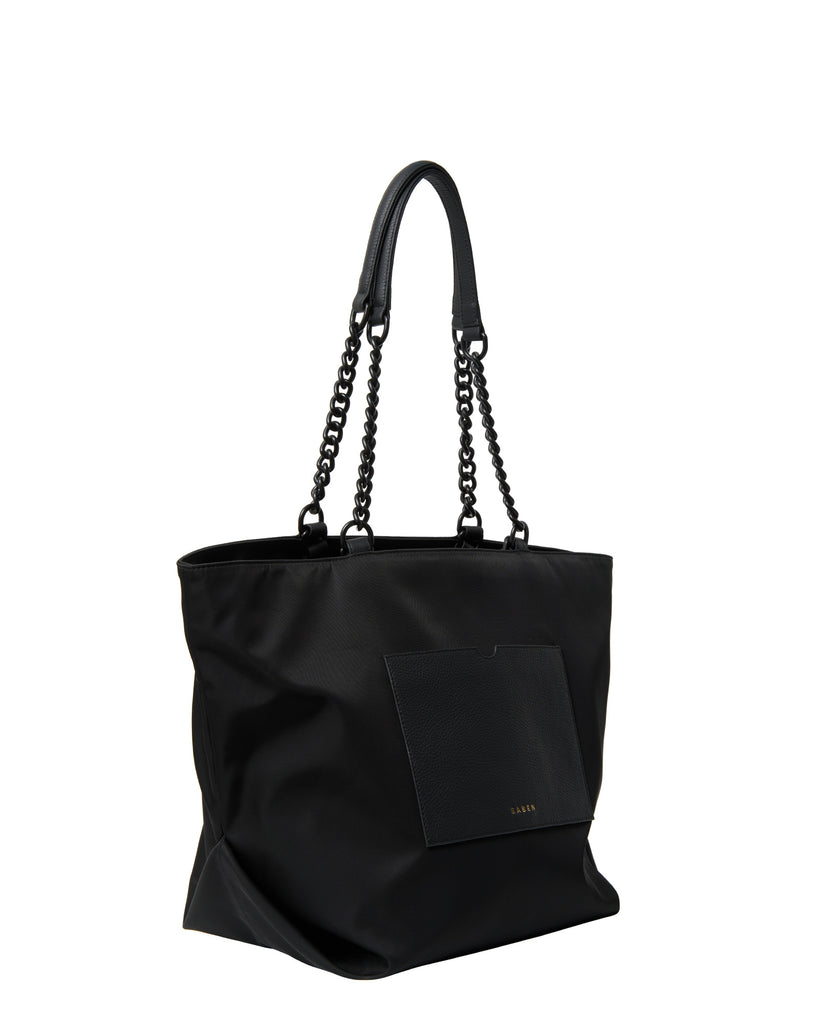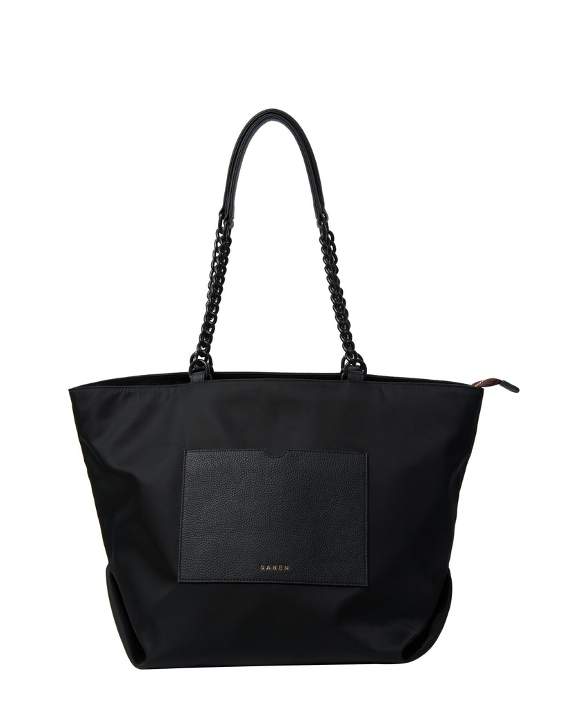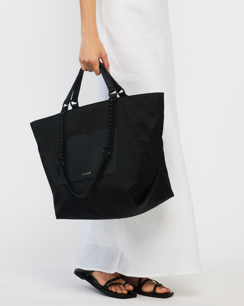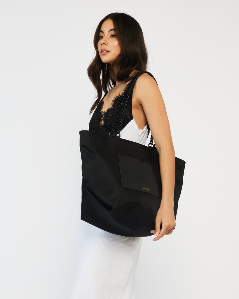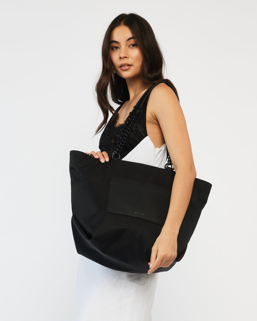 Introducing the Porto tote, made with innovative heavy duty recycled nylon that is both lightweight and timeless. Porto is the larger version of Saben favourite Paris Tote. Thoughtfully designed, Porto’s handles have been made to tuck inside the bag, so you can switch from shoulder bag to top handle tote at a moment’s notice. Feature chain strap handles with leather shoulder rests make for a comfortable commute. - Three separate internal compartments - Long handle and short handles - fold inside bag - Large internal zip compartment - Small zip pocket + drop pocket - 47W x 34H x 23D