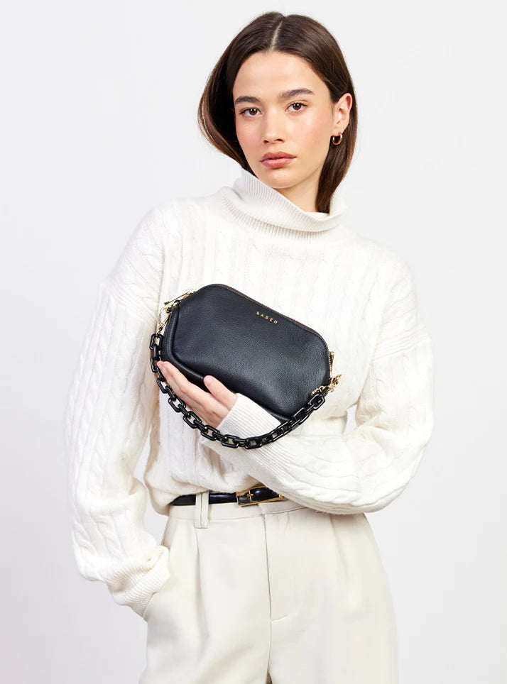 Transform any bag with one of our chain feature handles. Drape them across the front of your Saben piece as bag-candy or use them as small handles to create a glitzy clutch.