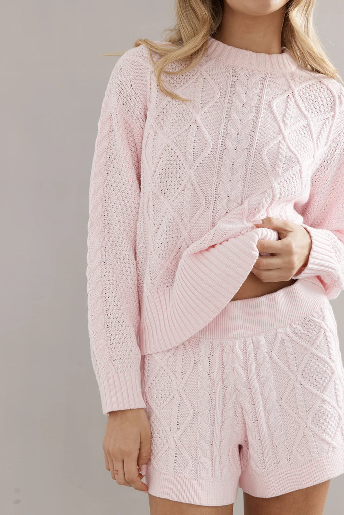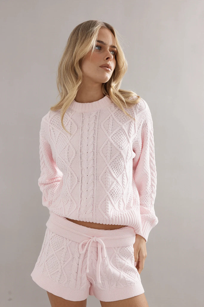 Designed for ultimate comfort and elevated lounging, our Cable Knit Pant blends relaxed elegance with refined texture. Crafted from a luxurious cashmere blend, these wide-leg pants feature an all-over cable knit, elasticated foldable waistband, and a draped silhouette that moves with you. Style them with the coordinating Pink jumper or a crisp shirt for the perfect off-duty look.