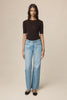 Washed for a soft hand feel, this jean is designed with a mid to high-rise waist. Finished with a traditional waistband, belt loops and a zip fly with button closure. Classic five-pocket construction provides functionality, while reinforced topstitching throughout enhances durability.  The fit is more form fitting, sitting closer to the body through the upper leg and has a subtle bootcut through to the hem, falling at a full length.