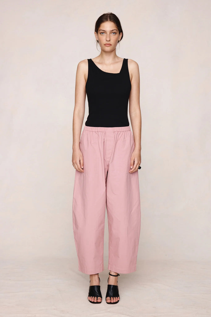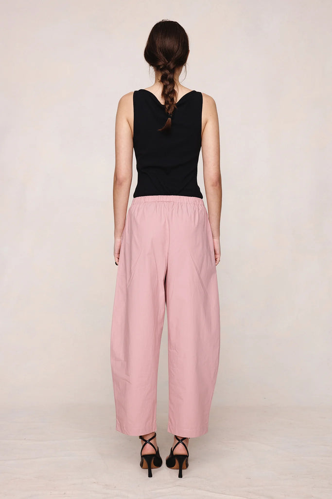 Ellidy pant in 100% cotton, barrel-leg shape, ankle-length finish, elasticated waistband, side pockets with bar-tack detailing, and tonal topstitching.