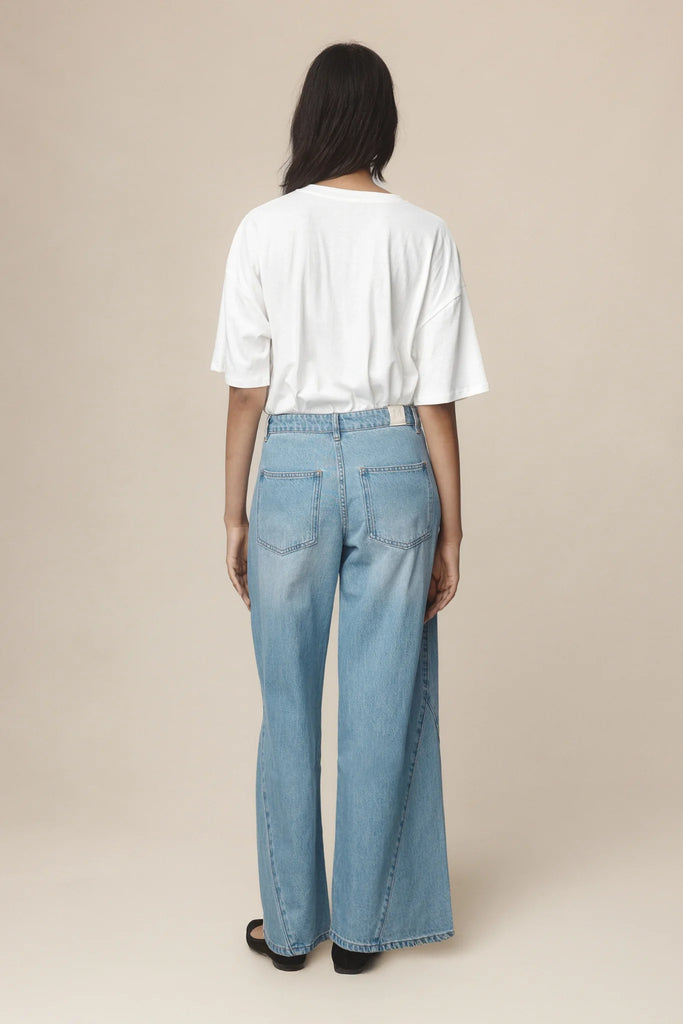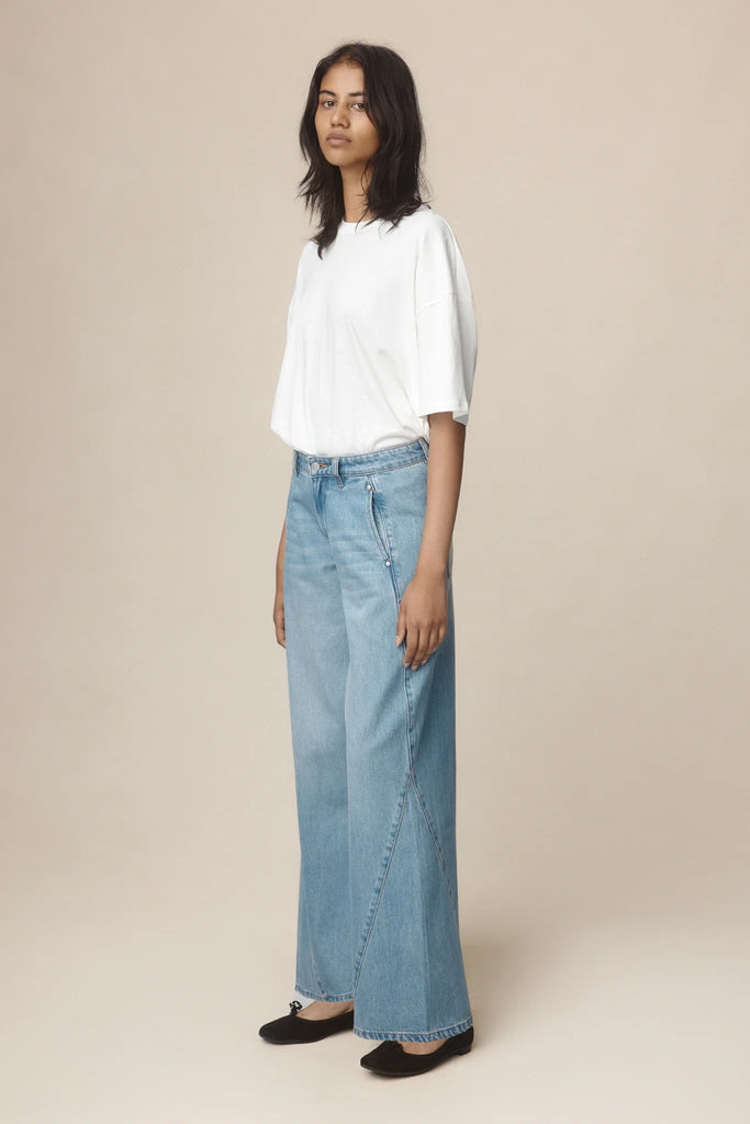 A wide-leg jean with a mid to low rise and godet inserts through the leg from the knee to the ankle, creating a softly sculptural detail. With side seam pockets reinforced with rivets, back patch pockets, belt loops, and a zip fly with button closure. The Panel Jean are made to wear lower on the hips.
