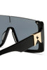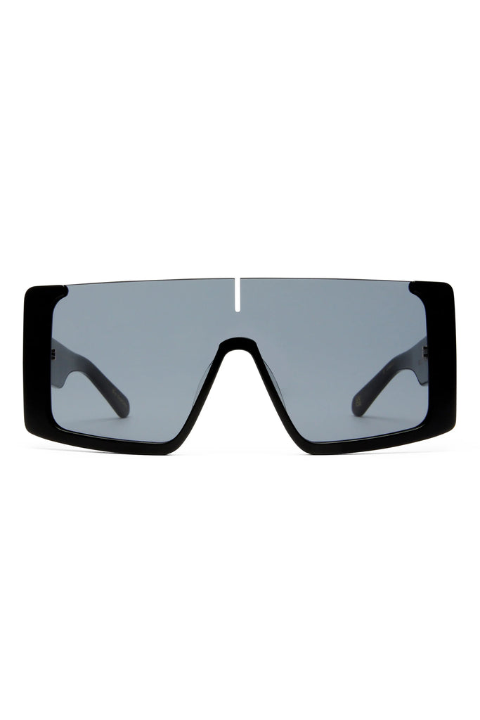 The Block Party in glossy black is a bold visor-style silhouette with strong angles and a futuristic edge. Finished with smoke mono lenses and gold-tone KW monogram hardware at the temples, it delivers sharp definition in a clean, continuous line.