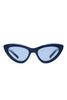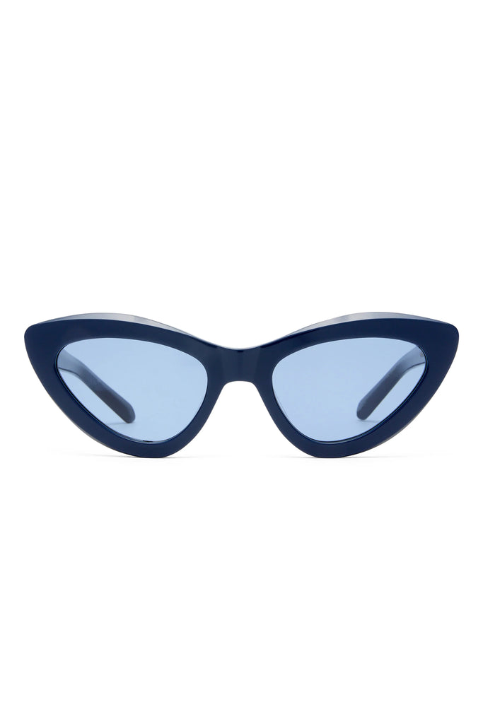 The Tundra in Prussian Blue pairs its striking cat-eye shape with softly tinted navy lenses for a deep, tonal look. With gold-tone arrow hardware at the temples, this sculptural frame brings a sense of quiet drama and considered detail.