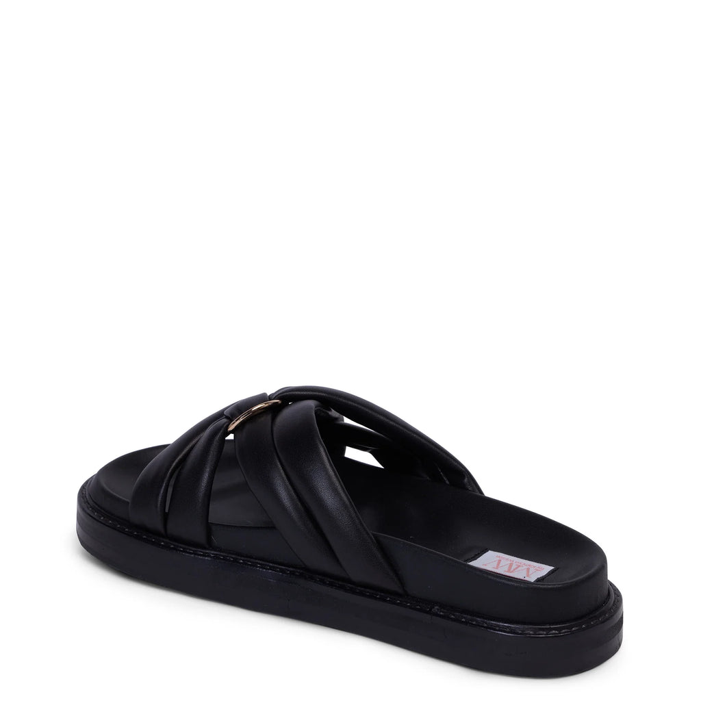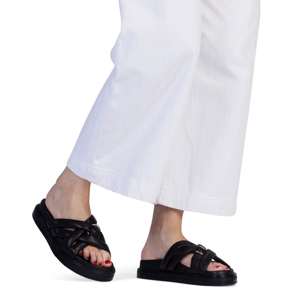 With a slight platform base, the Sienna Slide evokes an elevated day-time mood. Shaped with a dual crossover strap and adorned with a gold ring accent. Assembled in the softest leather and set on a comfortable moulded insole.