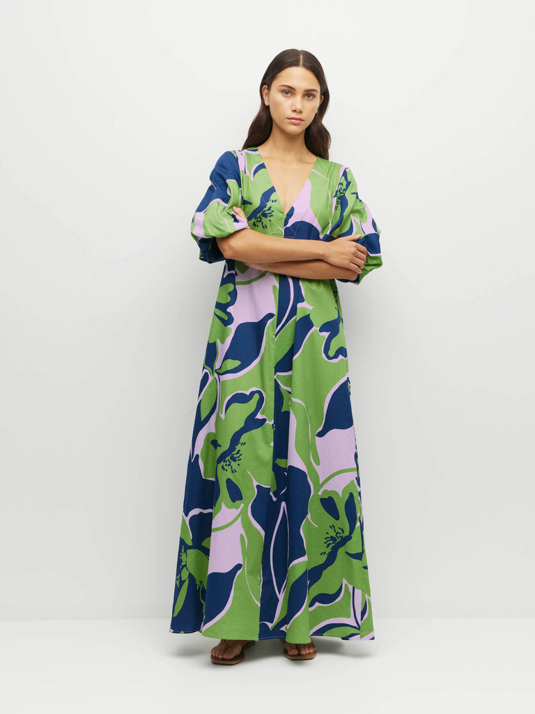 Introducing the Piper Dress - an amalgamation of adored design elements. With an elegant deep V neckline, dramatic puff sleeves, and versatile A-line ankle length skirt, the Piper Dress is an easy care summer wardrobe hero.