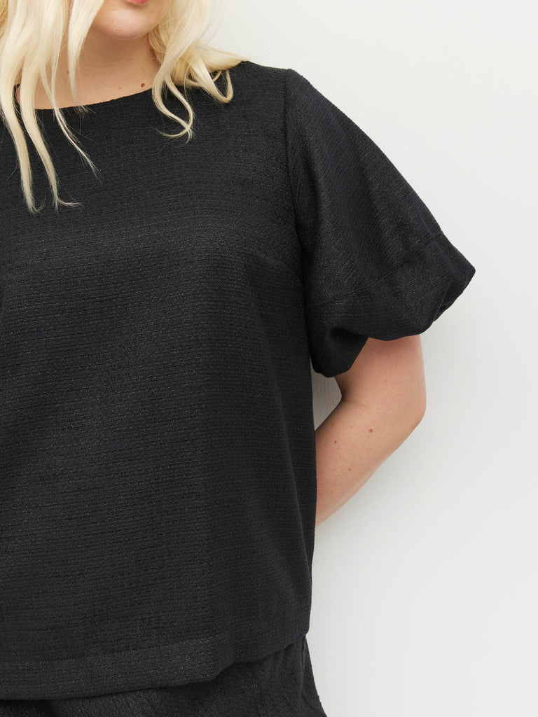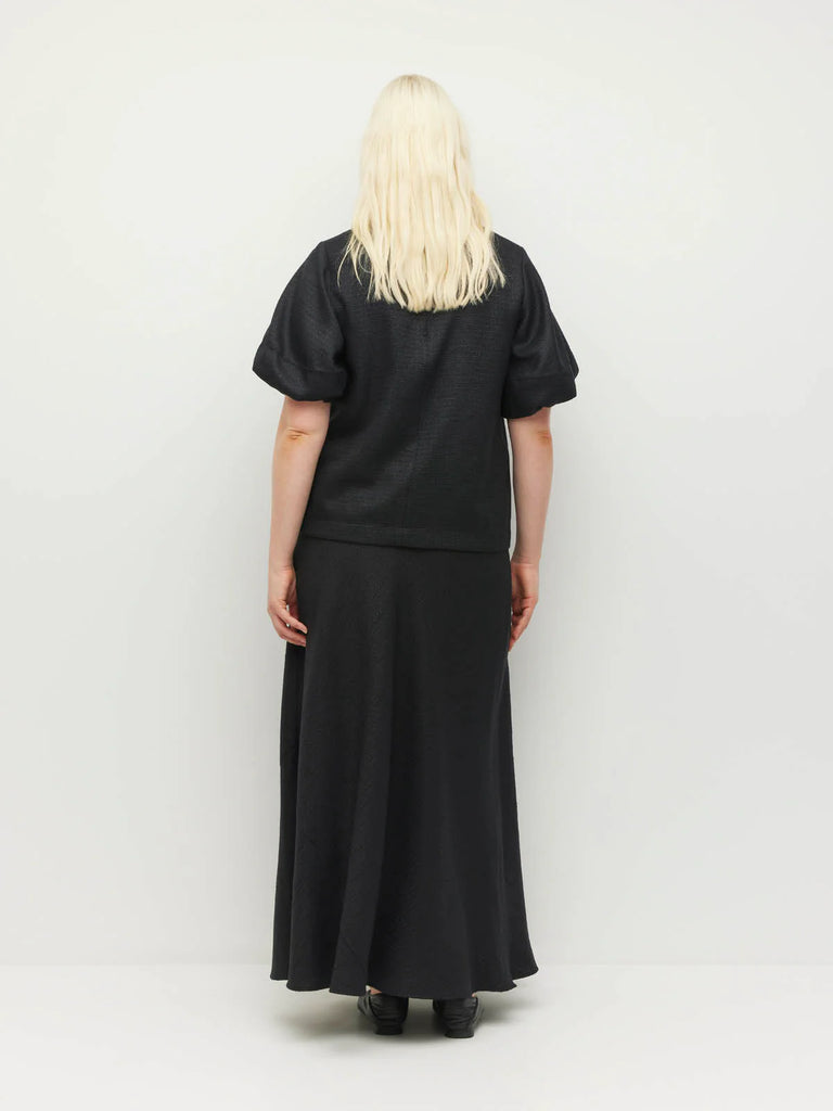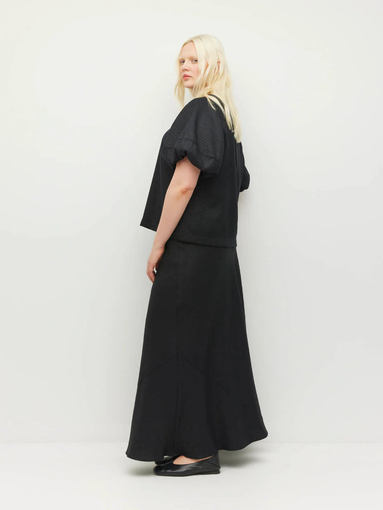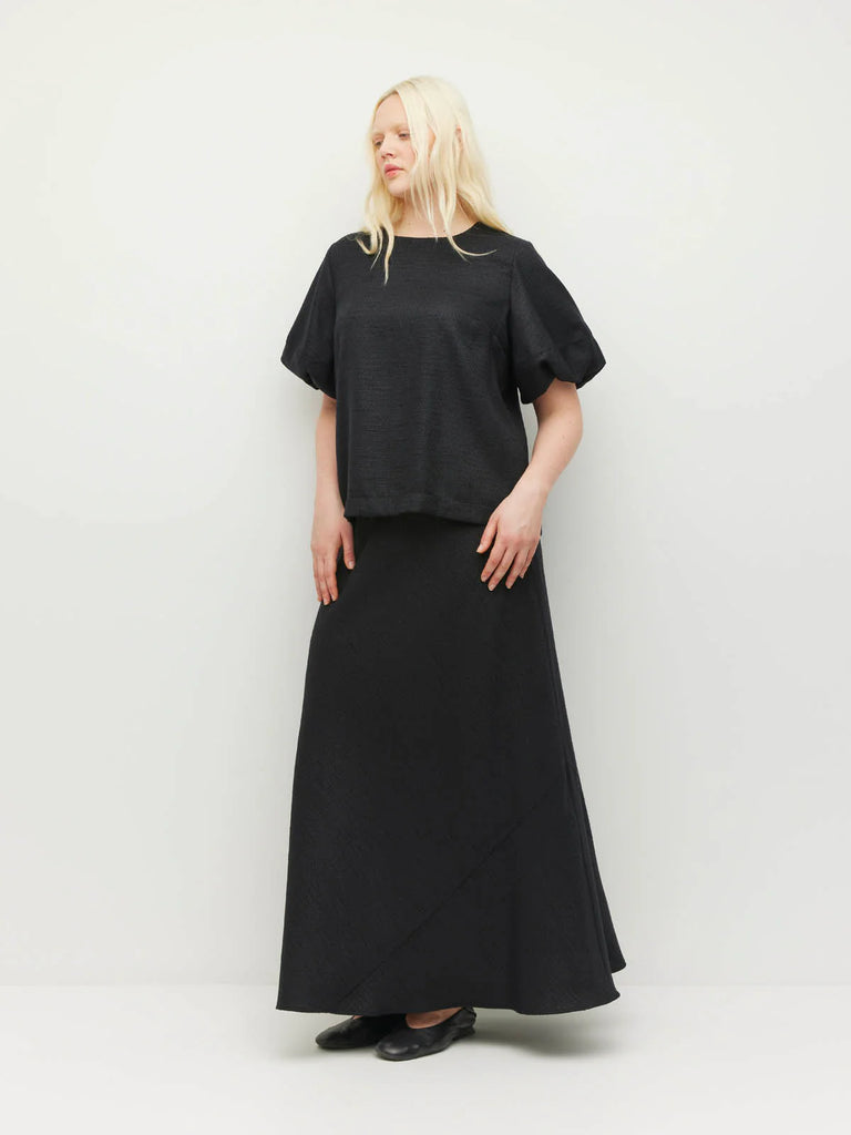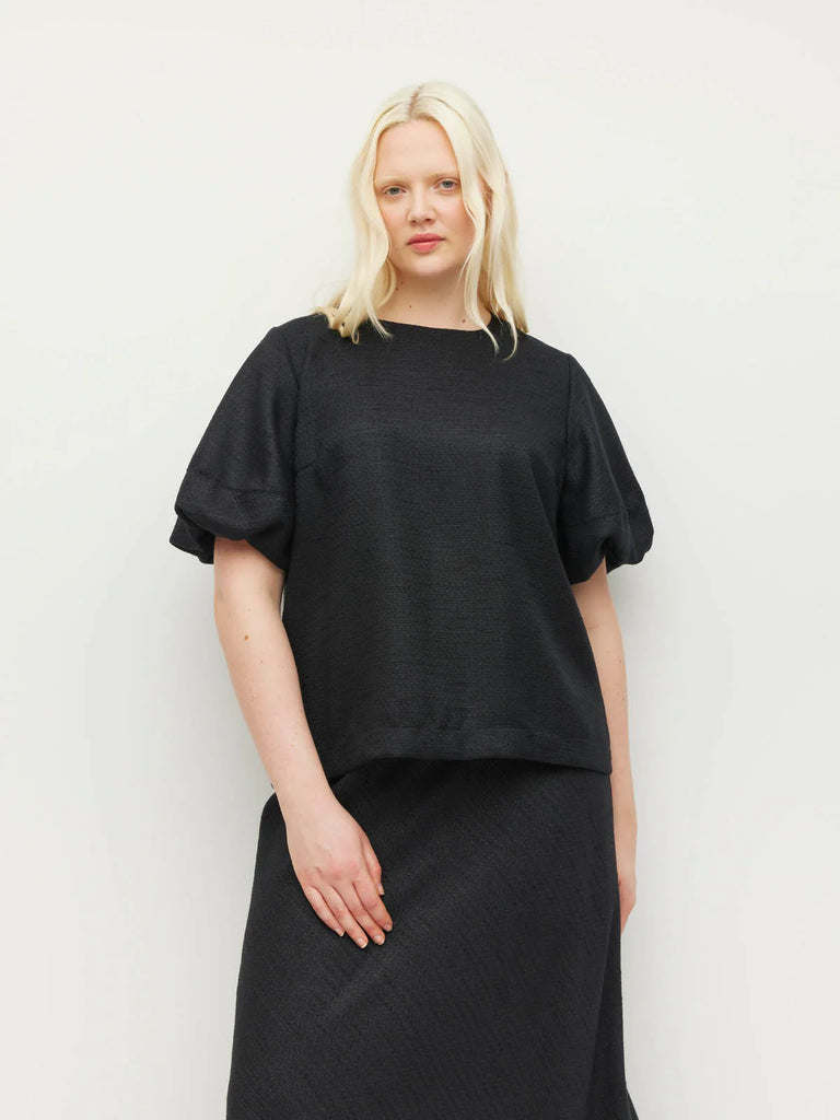Crafted in our textured Soft Sparkle Suiting, our new Loro Top is a refined piece to elevate any ensemble. The combination of the simple crew neckline with a statement puff sleeve make this a wearable piece. Elevate with the matching Arielle Skirt for an event ready ensemble, or wear casually with simple denim or Luxe Suiting.
