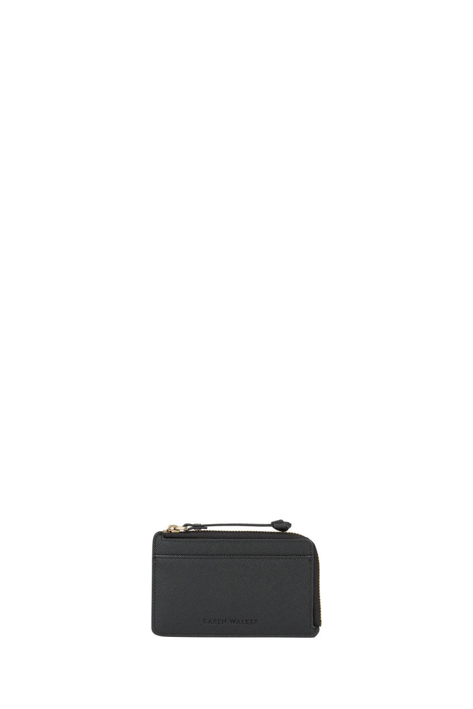 Crafted from 100% crosshatch leather and finished with a secure gold zip, this sleek black cardholder keeps your cards neatly organised – featuring a secure compartment for coins or keys. Its compact design makes it perfect for carrying alone or slipping into a larger bag for everyday convenience.