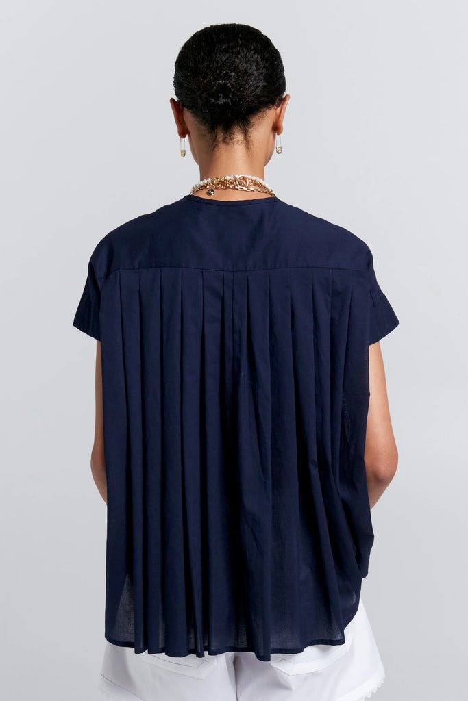Designed for those warm days when you need both style and comfort, the Furrow Sleeveless Shirt is made from breathable organic cotton. Offering a relaxed fit and subtle pleated details, making it perfect for layering or wearing solo. The refined gold-tone buttons down the middle lead to a delicate bow at the neckline, adding a feminine touch to this versatile shirt.