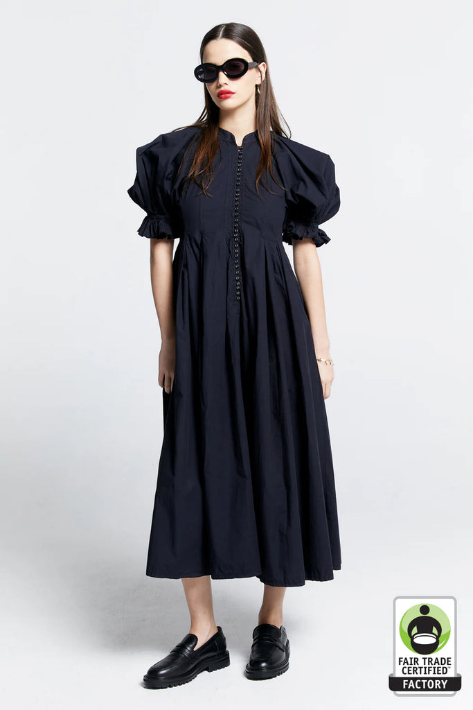 Puffed with wonder, the Melody Dress, crafted in organic cotton, features skywards reaching sleeves blooming with romance and neatly cinched-in at the elbow. Structured linework around the bodice, alongside sweet Victorian-esque buttons create a form fitting silhouette, while an invisible zip adds ease when putting it on. Pockets at the waist add discreet utility, while neatly tucking pleats open to a generously flowing midi length hem.
