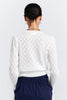The Pearl Lace Cardigan is spun from a superfine pointelle knit that gives it a delicate, airy feel. The subtle argyle design brings texture and charm, while ribbed cuffs at the waist and sleeves create a flattering shape. Finished with gold-tone buttons, it’s a versatile piece that layers easily and adds refinement to any look.
