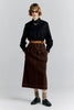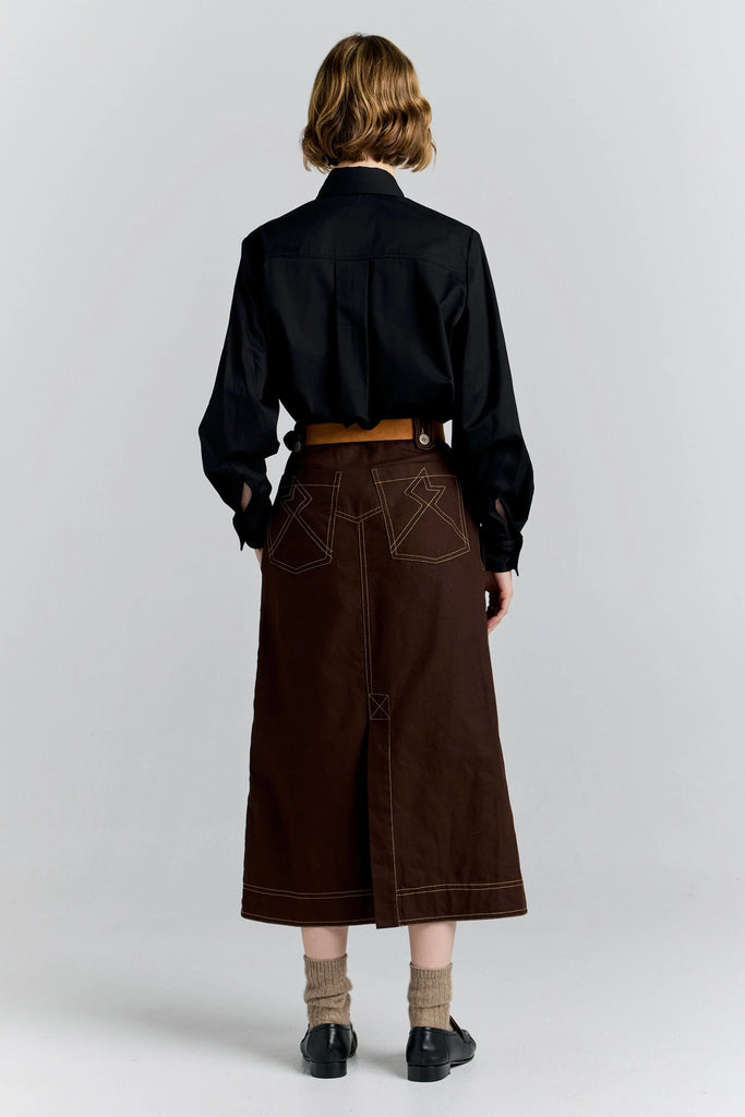 The Wayfare Skirt is cut in durable organic cotton canvas, a fabric chosen for both strength and structure. Falling to a midi length, it provides a versatile foundation for dressing – whether paired with tailoring for formality or knitwear for off-duty wear. Signature monogram stitching details the back pockets, offering a subtle point of distinction. A piece that holds shape while offering ease.
