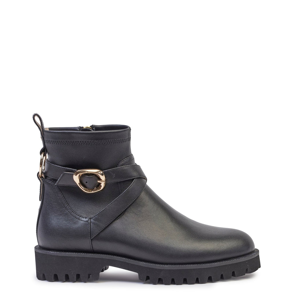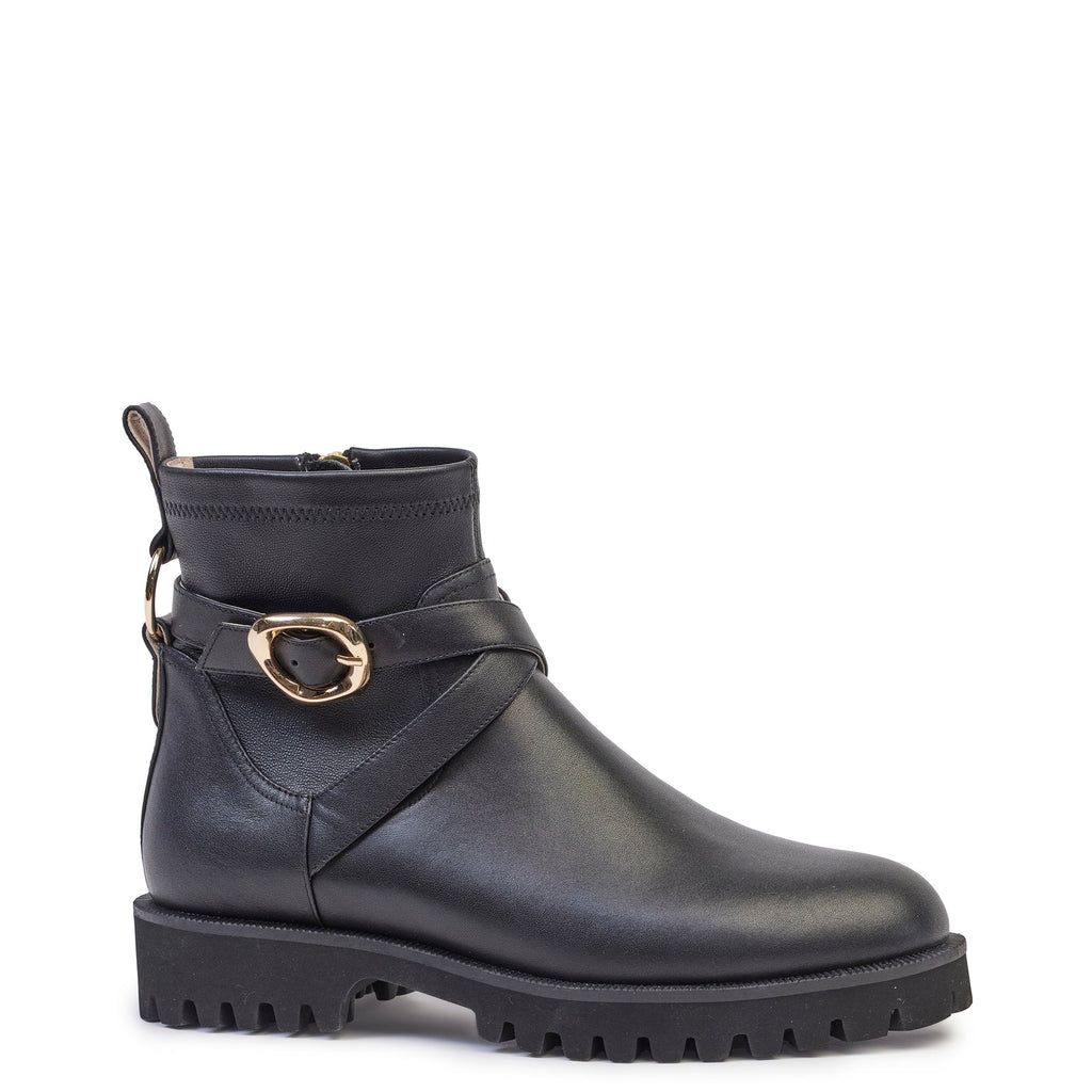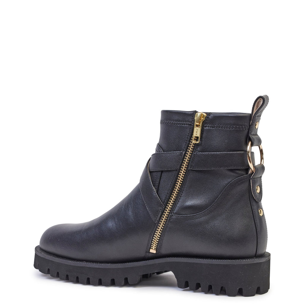 A classic combat boot silhouette crafted from smooth leather with tonal stretch leather around the ankle for the perfect fit, every time. The Peyton Boot features a chunky tread sole and gold metal hardware.