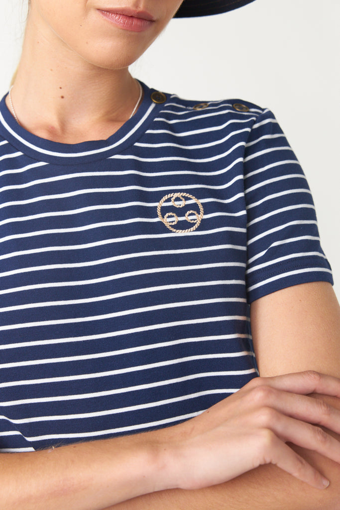 The Nautical t-shirt is the perfect summer top. Made from 100% cotton, the fit is neat but easy. Our Huddle logo is embroidered on the chest, and the shoulder features metal button openings.