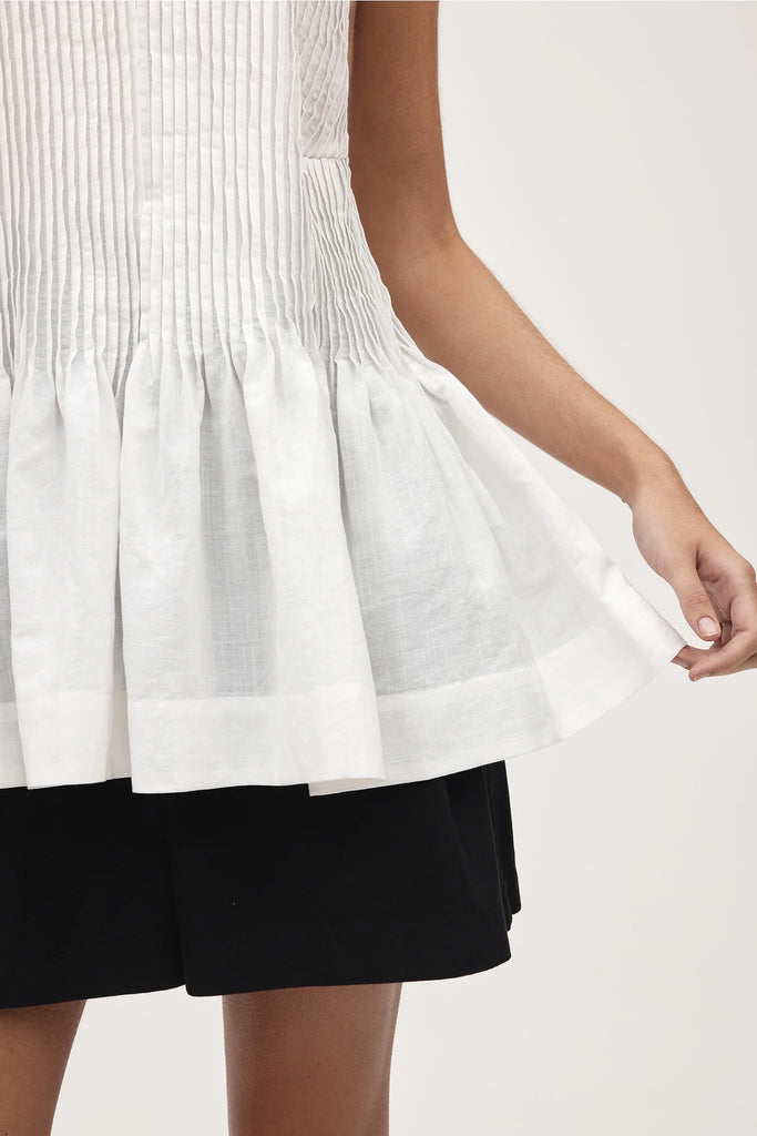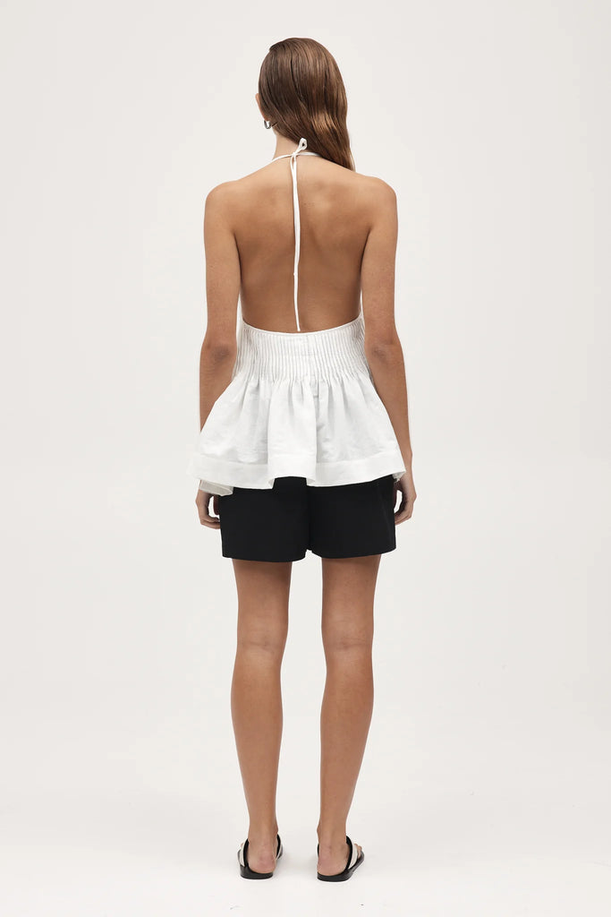 The Paisley Top is a beautiful and feminine piece crafted in a unique ramie / cotton cloth. This top features a round neckline and halter silhouette, with thin straps that tie at the back of the neck. The body of this top features fine tucks before falling into a exaggerated hem.