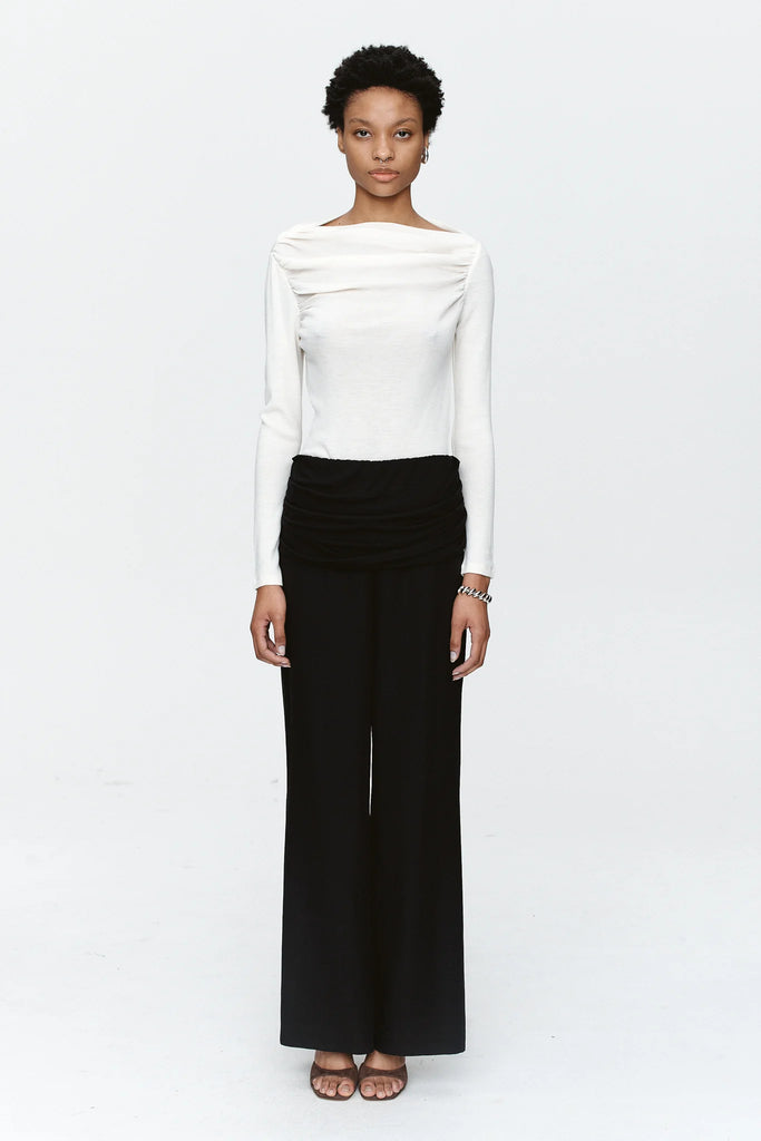 The Sid Pants are crafted in a tencel / linen cloth and feature a basque detail at the waist which is crafted in 100% tencel and creates a draped silhouette and subtle contrast between the two fabrics. These pants sit on a thin elasticated waistband and feature a straight wide leg and fall to a full length.