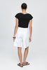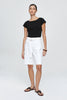 Knee-length shorts constructed from 100% organic cotton. Designed with a mid-rise waist and structured shape. Features include a zip fly with button closure, angled front pockets, patch pockets at the back and a self-fabric belt with metal D-ring hardware. Finished with topstitching to reinforce all seams for durability.