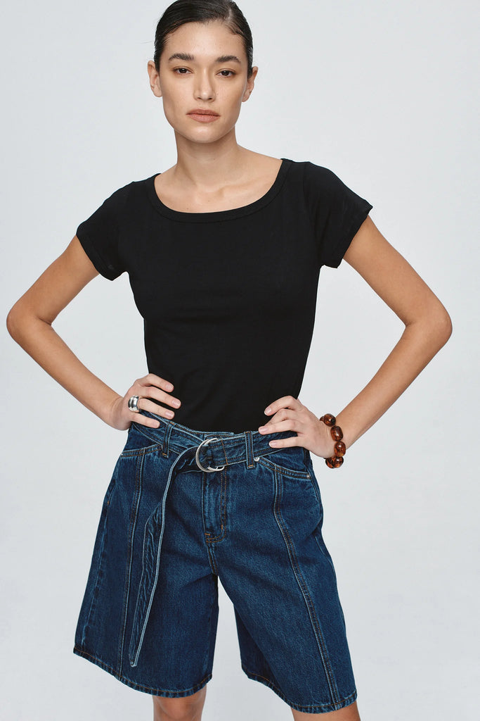 Knee-length shorts constructed from 100% organic cotton. Designed with a mid-rise waist and structured shape. Features include a zip fly with button closure, angled front pockets, patch pockets at the back and a self-fabric belt with metal D-ring hardware. Finished with topstitching to reinforce all seams for durability.