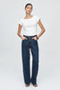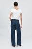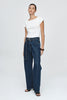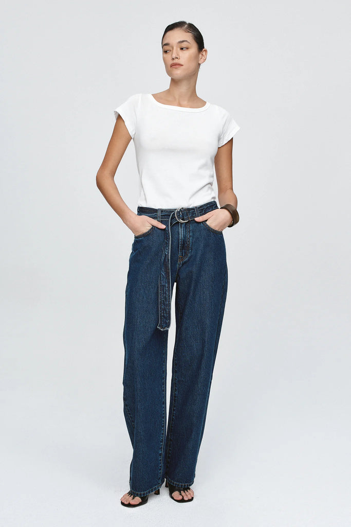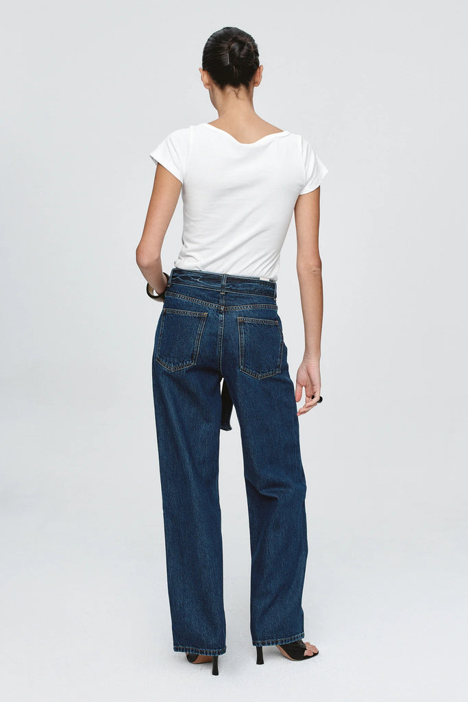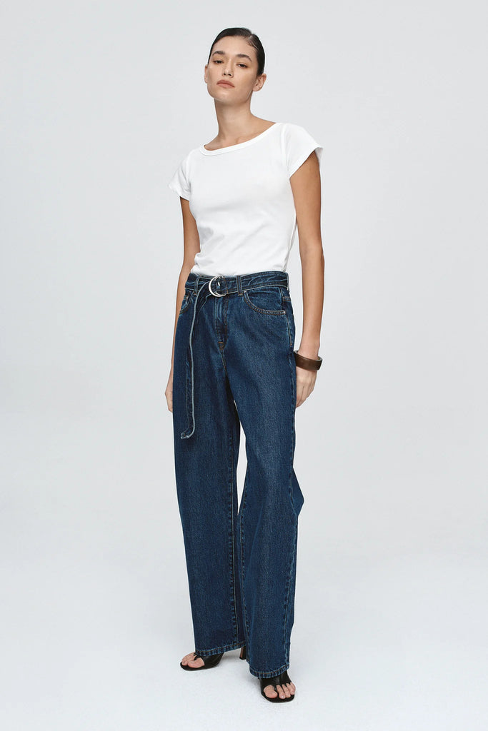 An iteration of our wide-leg jean cut in 100% organic cotton. Sitting neatly at the waist and hips. Designed with a self-fabric belt with metal D-ring hardware, allowing for subtle adjustability at the waist. Finished with a mid-rise waistband, zip and fly closure and classic five-pocket construction. Finished with topstitching to reinforce all seams for durability.
