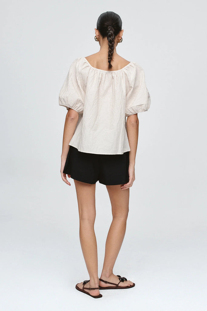A relaxed fit top with an exaggerated A-line shape to the hem at waist. Features a wide square neckline with a narrow vertical strap forming a front cut-out detail. Designed with short balloon sleeves finished with gathered seams for added volume.