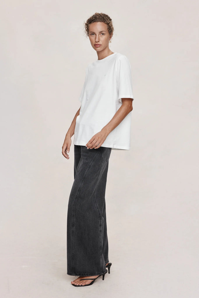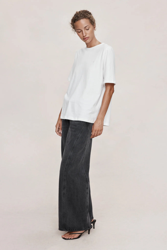 Oversized short-sleeve tee constructed from a lightweight cotton. Designed with a wide cut through the body and extended sleeve length for a relaxed shape. Finished with a classic crew neckline and clean hems.