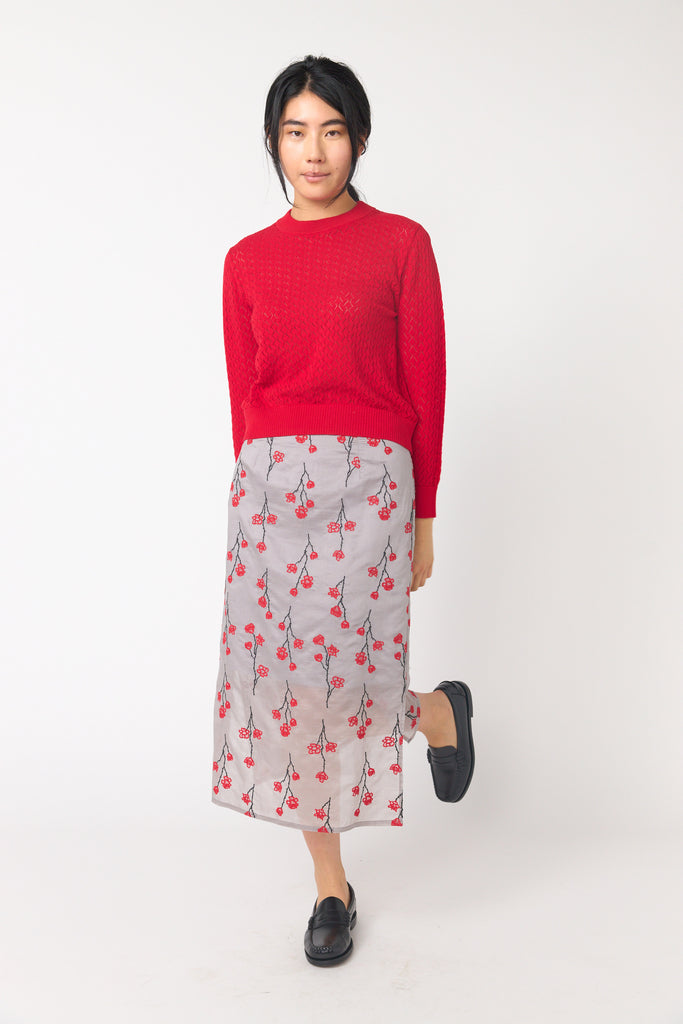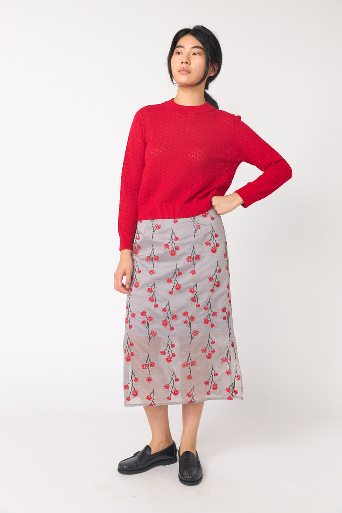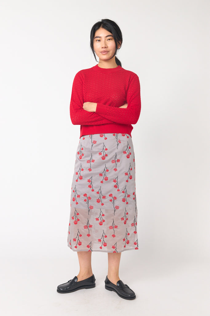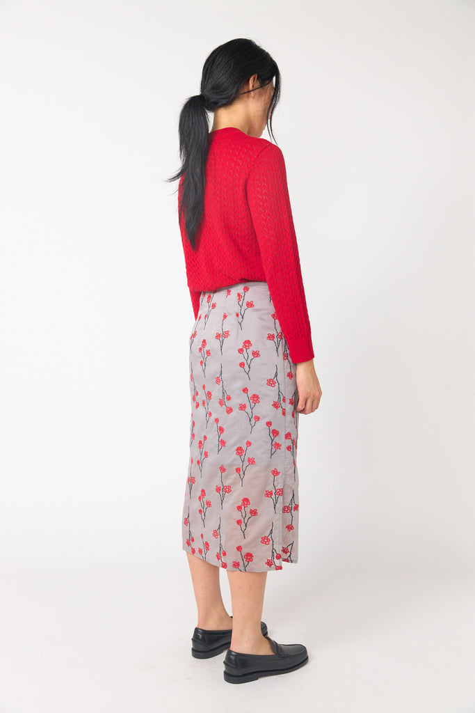 The Rose Skirt is a low-waisted, straight silhouette featuring our signature rose embroidery. Two side slits add ease of movement, making it as comfortable as it is elegant.