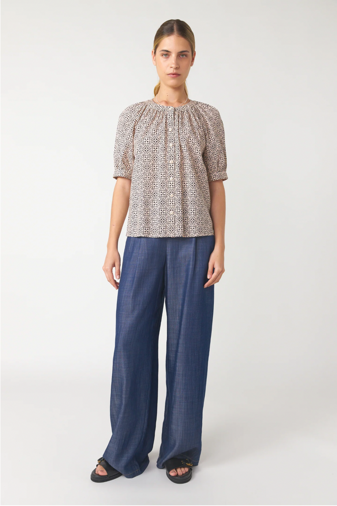 The Mosaic top by Sylvester features a summer mosaic tile print. Designed to be an easy fit top, it has elbow-length sleeves and a round neck with gather detail. A note on sizing. Our Mosiac top runs slightly small. If you are between sizes, we recommend sizing up. Bernie is 5'9 and wears size 8.