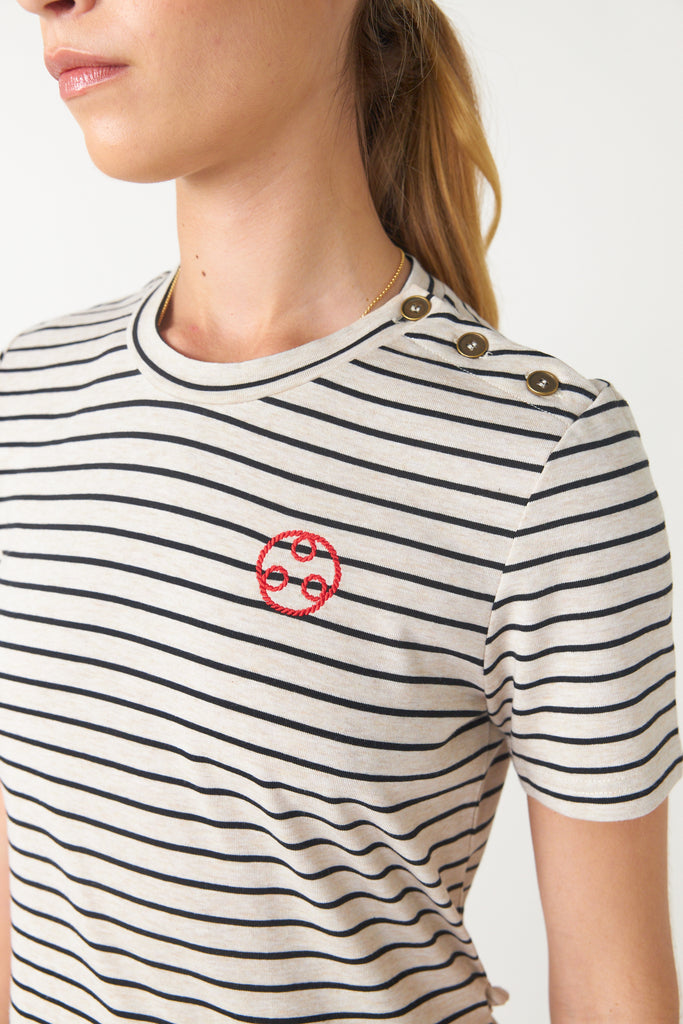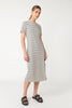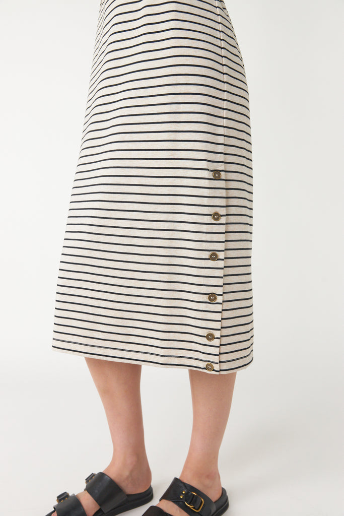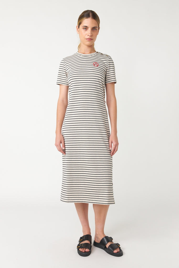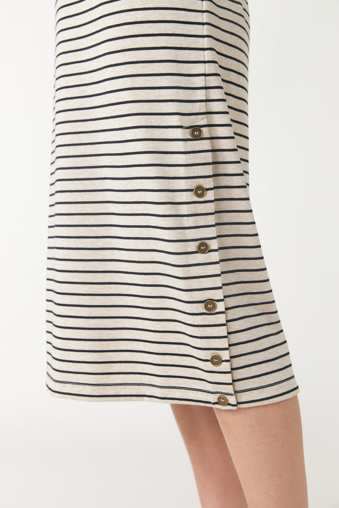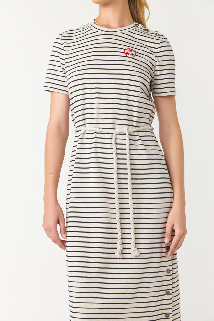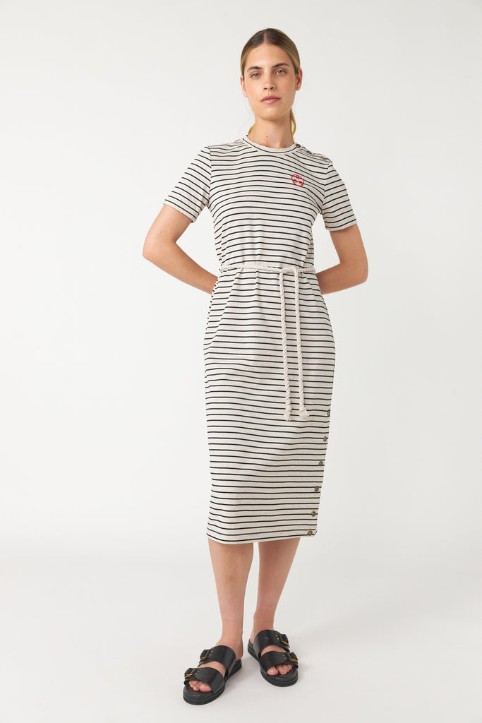 The Nautical dress is a quintessential Sylvester summer dress. Made from 100% cotton, the fit is neat with a straight skirt and calf-length finish. Cute details include metal button openings on one shoulder, a slide split, and a rope belt. Style with sandals or sneakers.