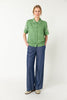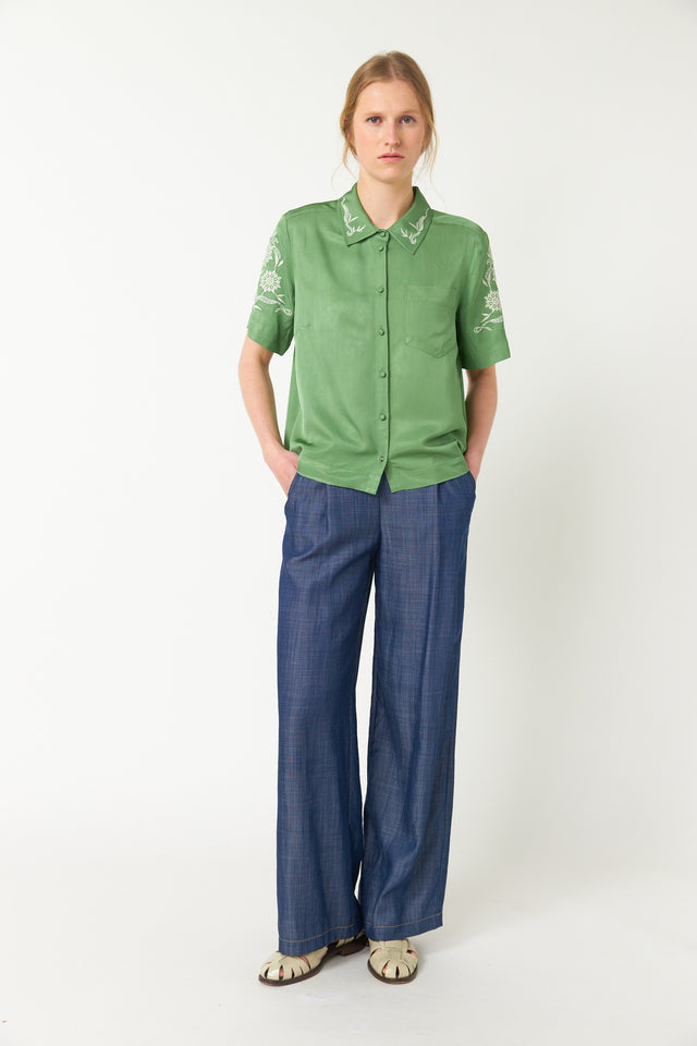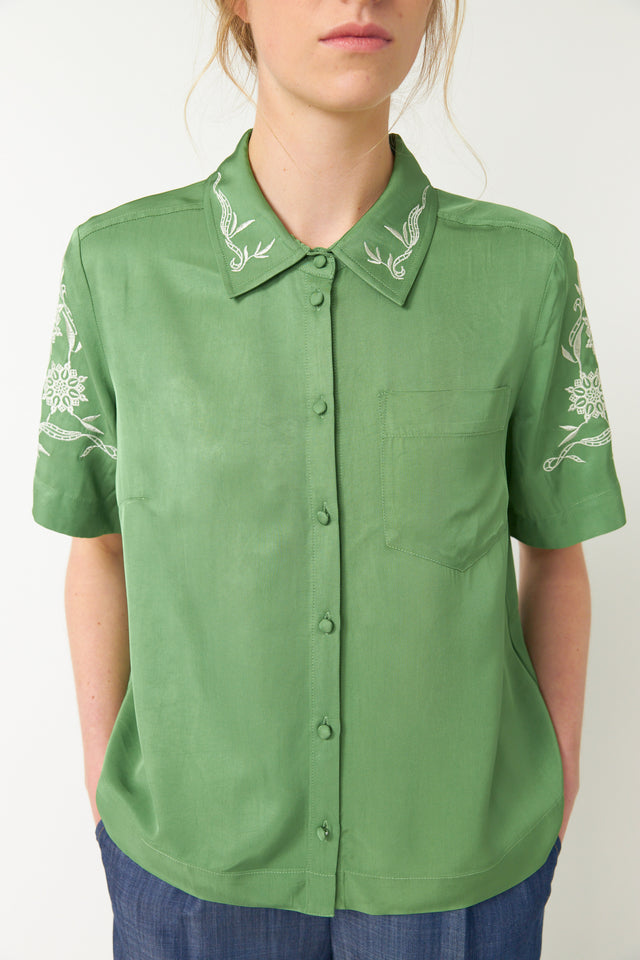 The Nova shirt is an easy fit, classic shirt featuring unique contrast embroideries on the collar and sleeves, and elevated covered buttons. It is fabricated in a lux, washed satin.