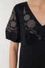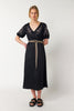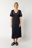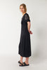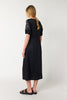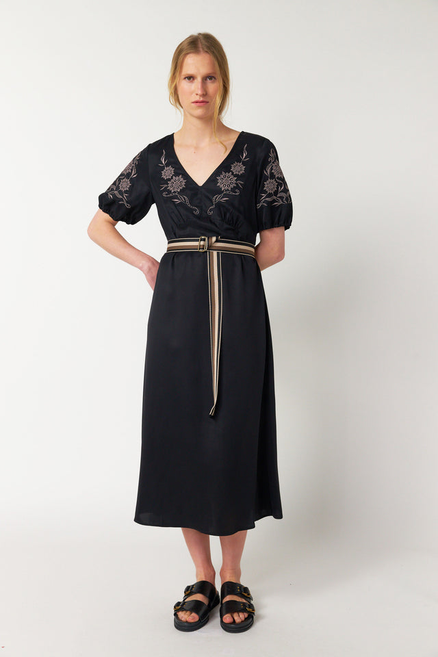 Our Nova dress features a beautiful, unique embroidery on the bodice and sleeves and is fabricated in a lux, washed satin. This dress is very flattering with a v-neck, shaped bodice and elbow-length sleeves with subtle gathering at the cuff. The flared skirt finishes at the calf. Pair with sandals or a heel for any occasion.