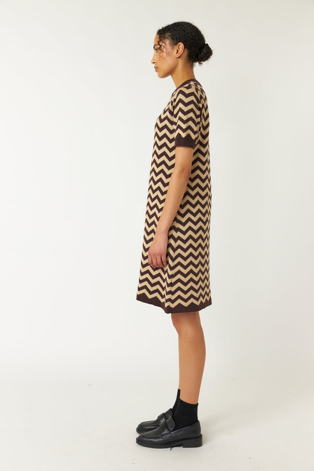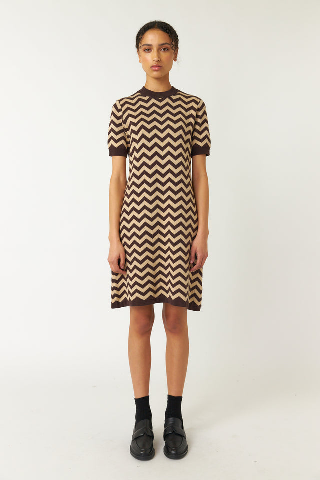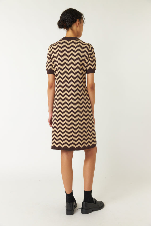 Our Twin peaks dress features a unique jacquard zig zag design. It’s a neat fitting A line dress that finishes just above the knee.