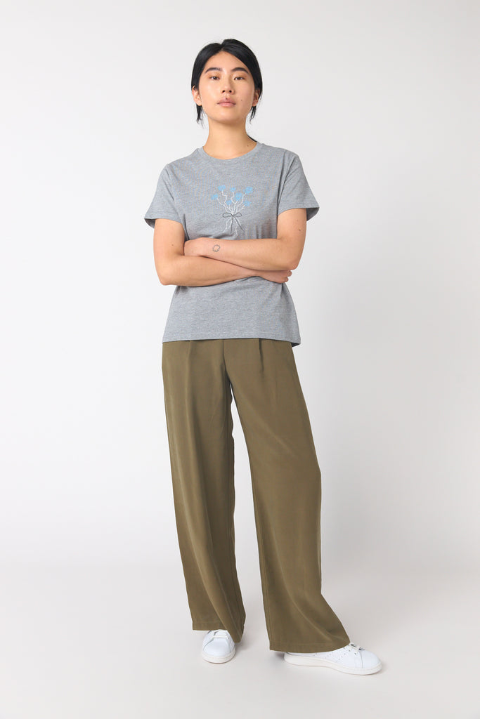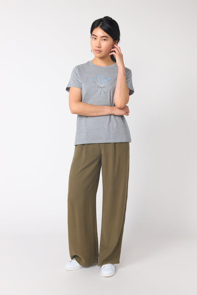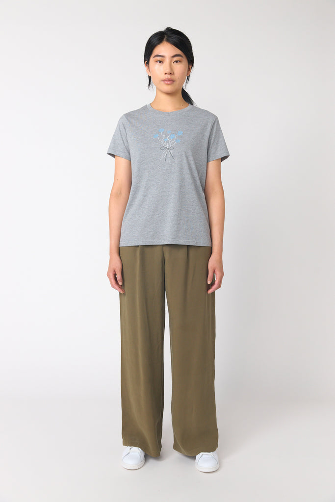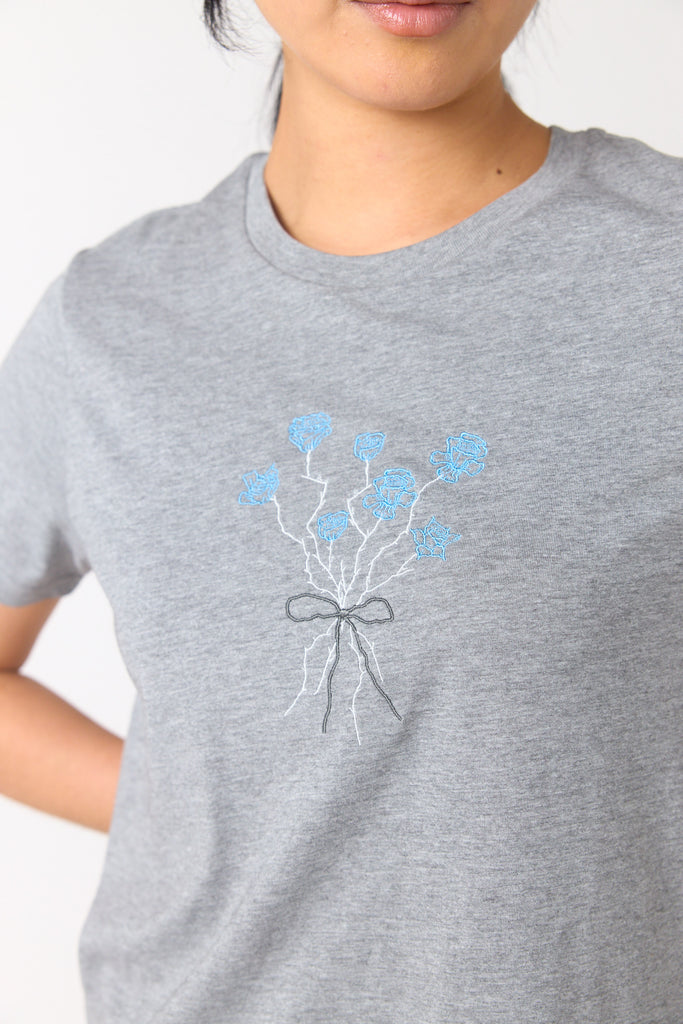 Tom's rose t-shirt is a classic t-shirt shape. It features a beautiful embroidered bouquet of roses designed by Tom Conway.