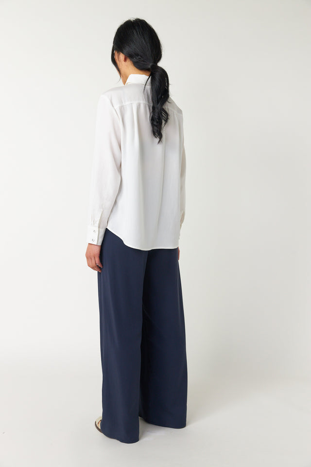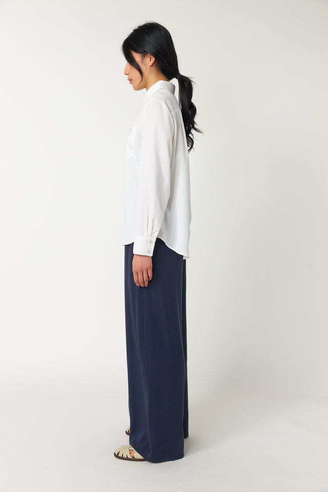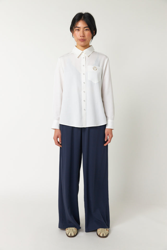 The Coco shirt by Sylvester is modern workwear made easy. Features include covered buttons throughout, a classic fold-down collar, and a singular patch pocket on the front. A subtle but strong huddle embroidery adorns the pocket. Wear the sleeves down or roll them up when necessary.