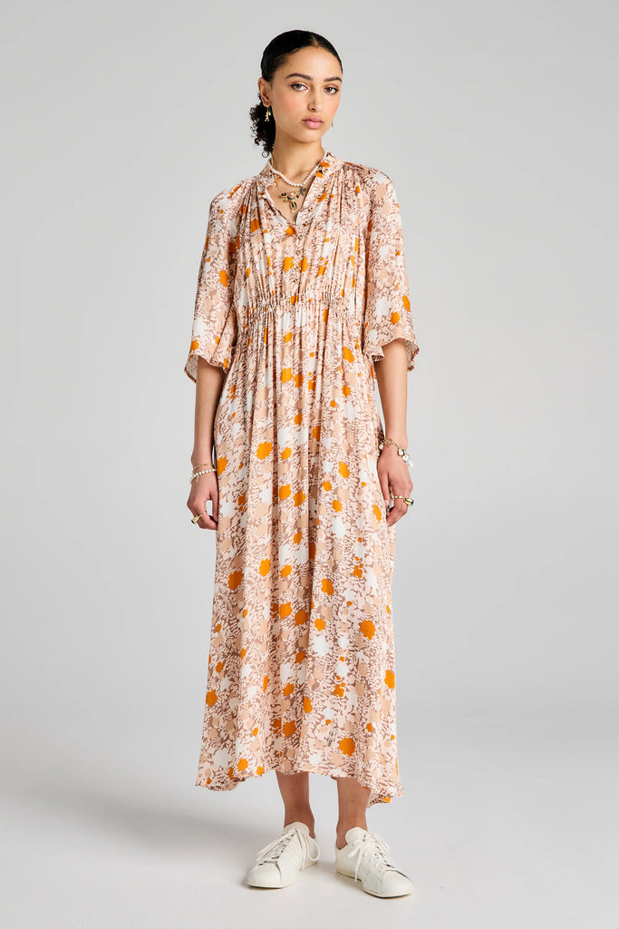 The Trinket Dress in Perfect Day Pink Multi is cut from a silk-viscose  dobby blend, showcasing our Perfect Day floral print with a gentle lustre. Its gold-buttoned front and adjustable drawstrings detailing at the front and back create a relaxed, flattering silhouette, complemented by a fluid long midi skirt with discreet pockets. Balancing comfort and polish, this piece is ideal for both everyday wear and elevated occasions.