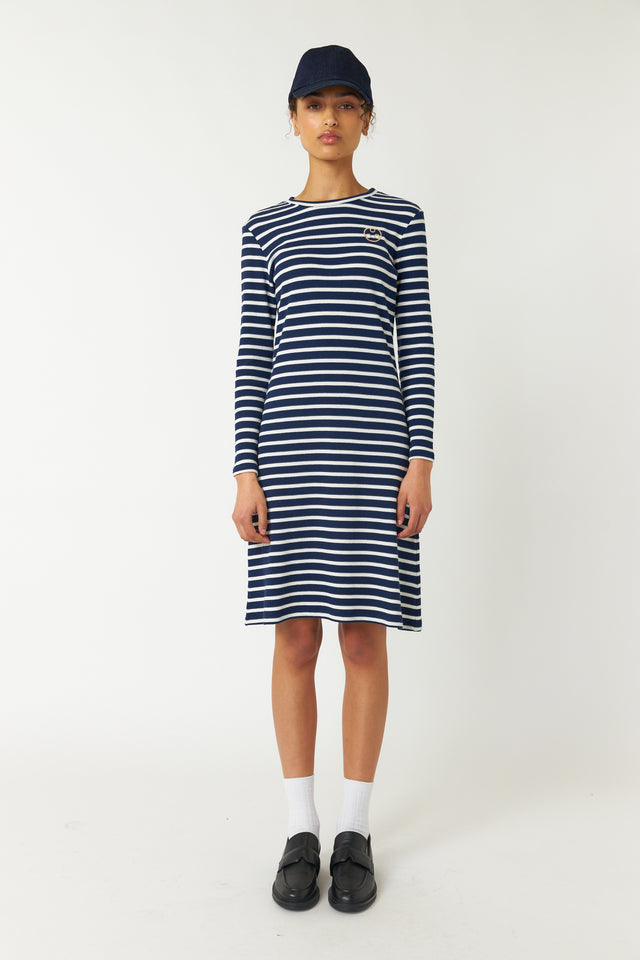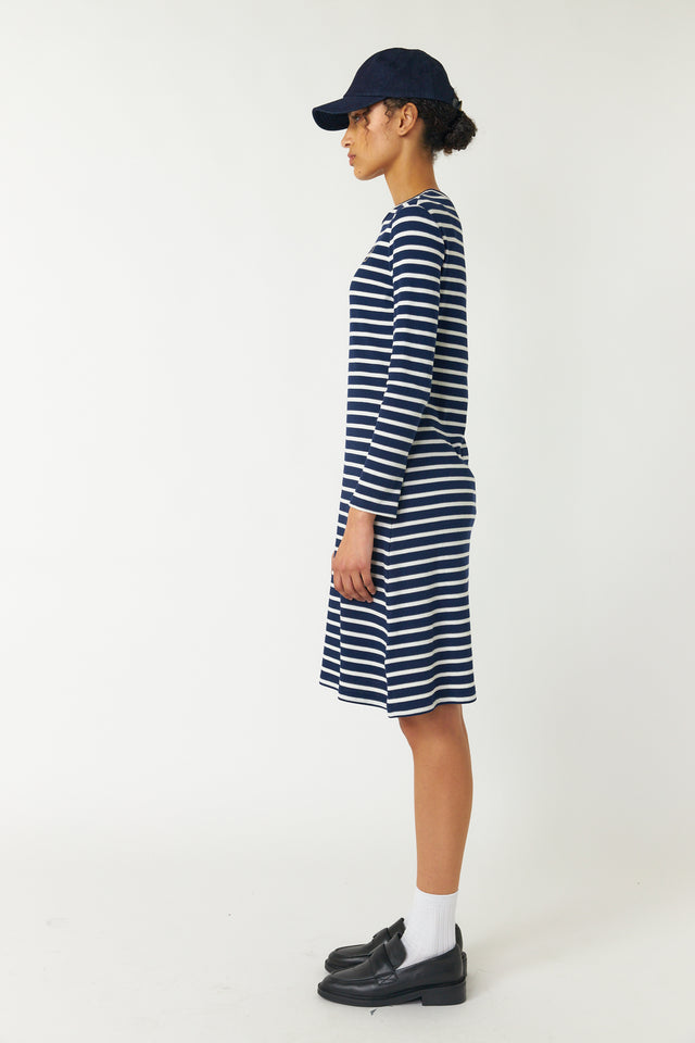 The Sailor stripe dress is neat fitting pull on style. It has a round neck, long sleeves and a subtle A-line skirt to the knee.